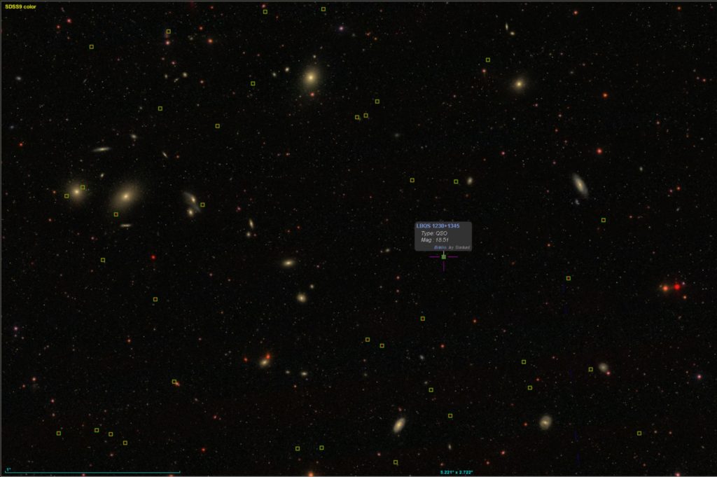 Dada la magnitud límite alcanzada tuve curiosidad de comprobar que otros objetos eran visibles. Consultando SIMBAD a través de la plataforma ALADIN (esto parece Disney Channel…) es posible tener acceso a multitud de catálogos, surveys y una cantidad de información increíble. Son herramientas habitualmente usadas por los astrónomos profesionales pero accesibles para todo el mundo. Tras unas cuantas horas intentando superar mi torpeza y aprendiendo a buscar lo que quería pude confirmar la presencia de unos 27 cuasares en la imagen con magnitud menor de 19.5. En la siguiente captura están marcados con un cuadradito en la imagen SDSS que aproximadamente coincide en encuadre.