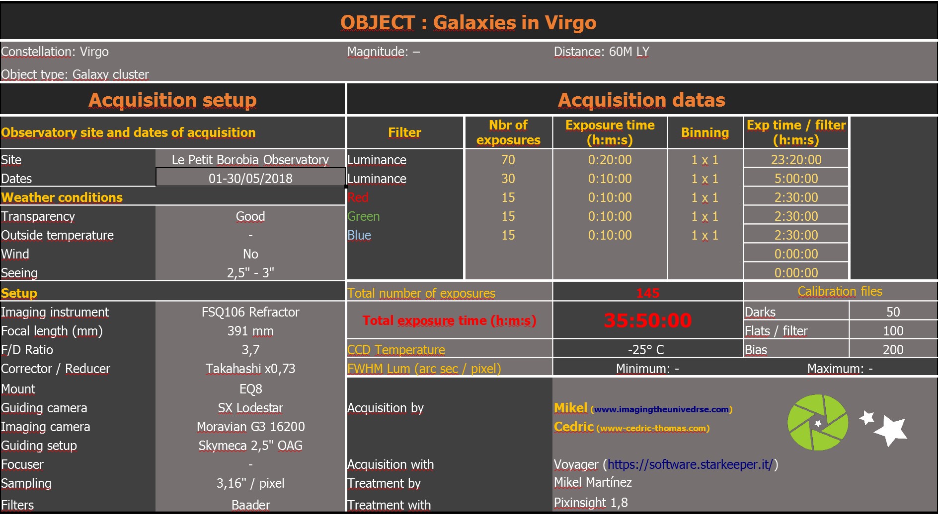Para esta imagen uno de los objetivos era adquirir suficientes datos de luminancia para poder mostrar las debilísima nebulosa de flujo integrado (IFN) que, rodeando nuestra propia galaxia,  se presenta como un velo muy débil cuando observamos zonas del universo mas allá de ella. Por eso la luminancia de la imagen esta compuesta por 70 imágenes de 20 minutos a las que he sumado 30 de 10 minutos. Un total de 23h de exposición solo para la Luminancia. Al final de la entrada se encuentra la tabla con todos los datos de la captura.