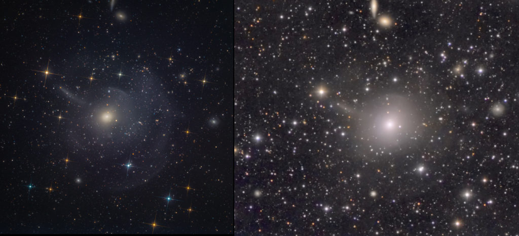 También pueden observarse estructuras debidas a esas interacciones en la galaxia M89. A su alrededor tiene una compleja estructura de conchas y plumas de estrellas fruto de la absorción de otras galaxias menores o como, otras opiniones así lo defienden,  resultado de su propia formación a partir de dos galaxias espirales. Además es claramente observable  una estructura de gas y polvo estelar que se extiende 150.000 años luz de la galaxia. Las mencionadas estructuras son perfectamente visibles en la magnífica imagen de Mark Hanson con la que se compara la obtenida por mí. Evidentemente, el equipo (abertura y resolución) empleado por Mark no es comparable al mío. Pero aún así, gracias a acumular datos esas mismas estructuras son visibles en mi imagen.
