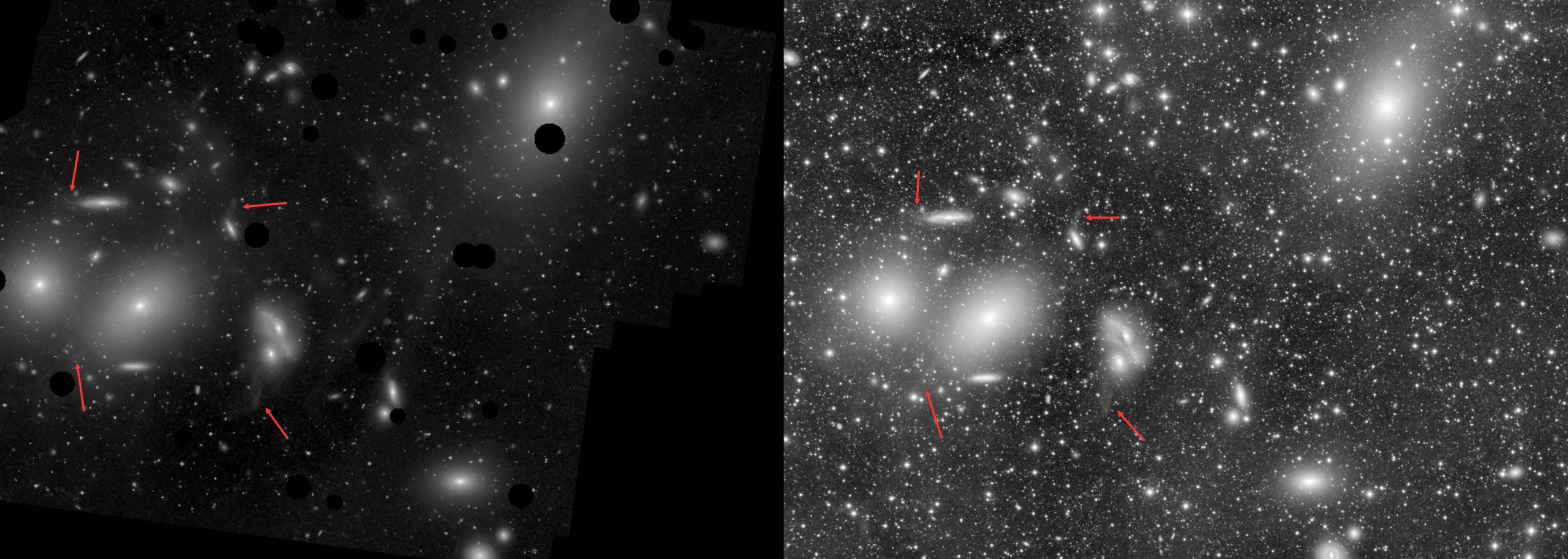 Comparando con los resultados obtenidos por Chris Mihos et al. con los de mi imagen, esta luz difusa intra-cúmulo fruto de estas interacciones puede verse en forma de jets y de las llamadas corrientes de marea de estrellas  en varios lugares.