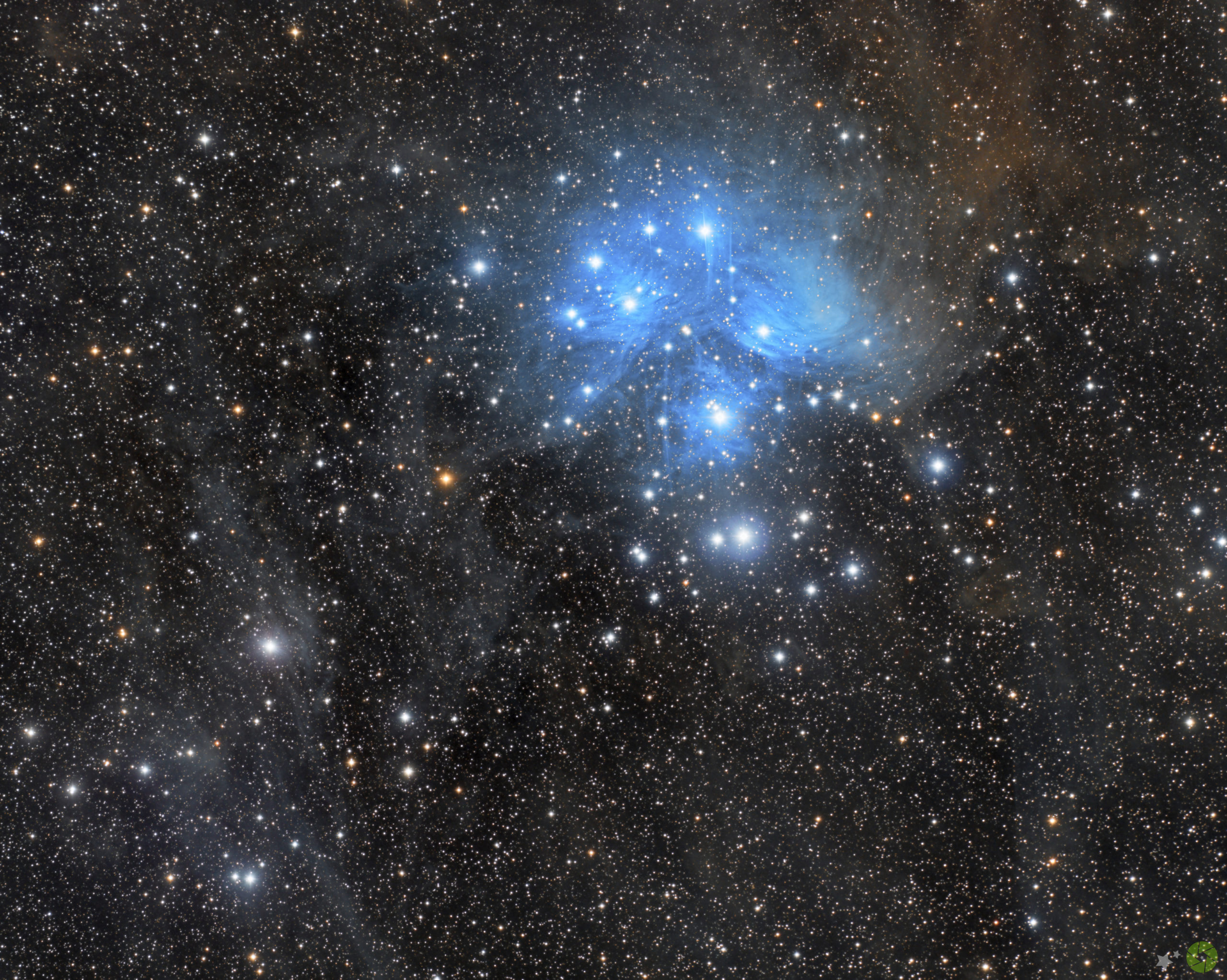 M45 es el cúmulo abierto más brillante y cercano a la Tierra. Sus 8 estrellas más brillantes forman un reconocible asterismo en la constelación de Tauro aunque realmente el cúmulo está formado por entre 500 y 1000 estrellas. En fotografía de larga exposición es muy característica la nebulosa azul de reflexión que brilla reflejando la luz de las jóvenes y energéticas estrellas que componen el cúmulo. Inicialmente se pensó que podrían ser los restos de la propia nebulosa que dío lugar a la formación de las estrellas del cúmulo. Aunque ahora se sabe que simplemente las Pléyades están atravesando una zona de nebulosas oscuras y polvo galáctico que ocupa gran parte de la constelación de Tauro. Como un coche avanzando por la noche entre la niebla.